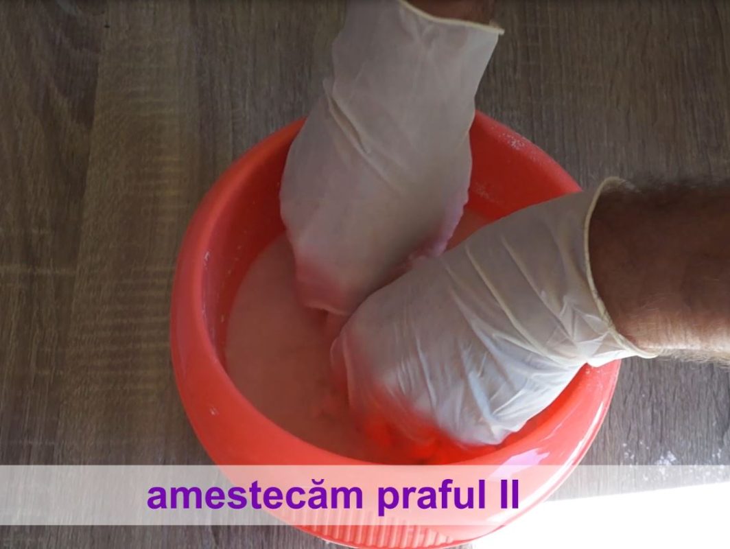 Turnaţi ‘Praf 2’ în apă. Lăsaţi ‘Praf 2’ să se înmoaie in apă aproximativ 30 de secunde. Amestecaţi unu-două minute cu mâinile -folosind mânușile din kit- pănă obţineţi un amestec omogen. Odată ce amestecul este omogen fărăbulgărașe, sunteţi gata de turnat în matriţă.